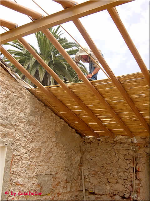 Mata Bicho e devidamente tratados com WOODBLISS – protector de madeiras biológico - contra parasitas. Sobre os barrotes são atadas as canas, em seguida é aplicada uma camada de isolante permeável aos vapores do ar, isolamento térmico (cortiça ou placa em fibra de madeira, por exemplo), tela de subcobertura e as telhas. As paredes foram equipadas com condutas de cobre que, ligadas à placa solar, servem como aquecimento. Para rebocá-las utilizamos argamassa de cal aérea.
