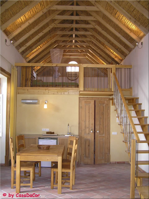 Apartamento com telhado tradicional de estrutura de madeira e forro de cana, paredes revestidas com reboco de cal, pavimentos de madeira (soalho) e terracota, casa de banho revestida com Tadelakt.